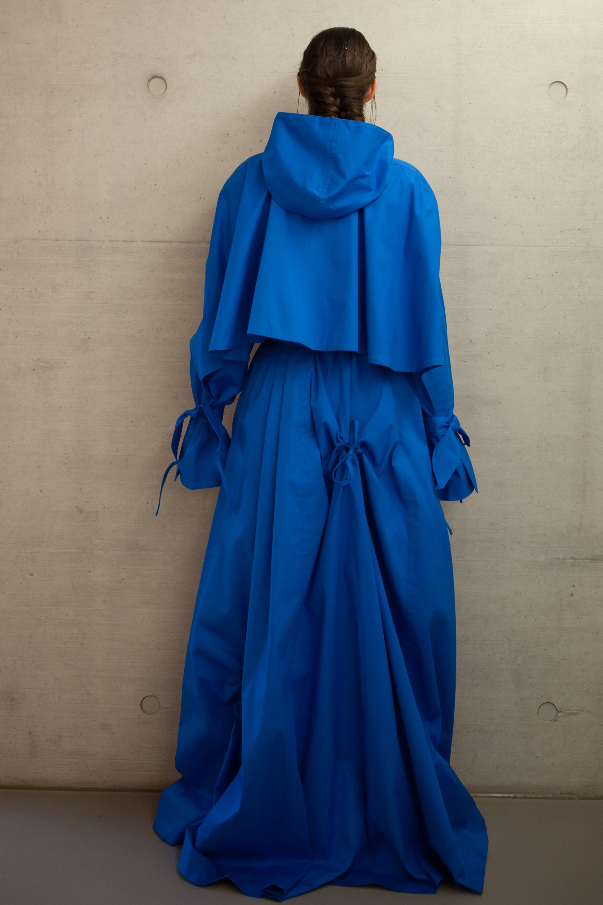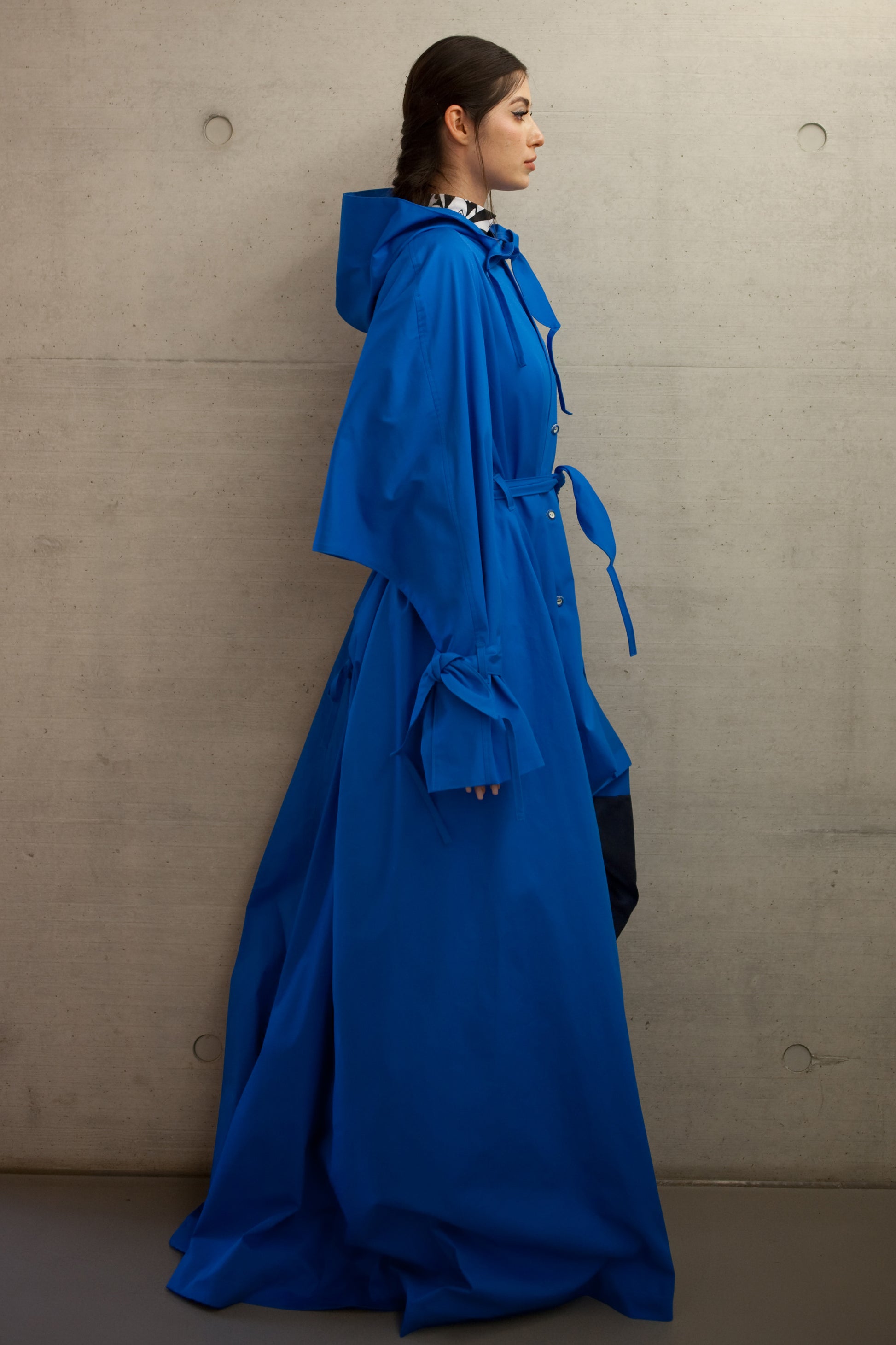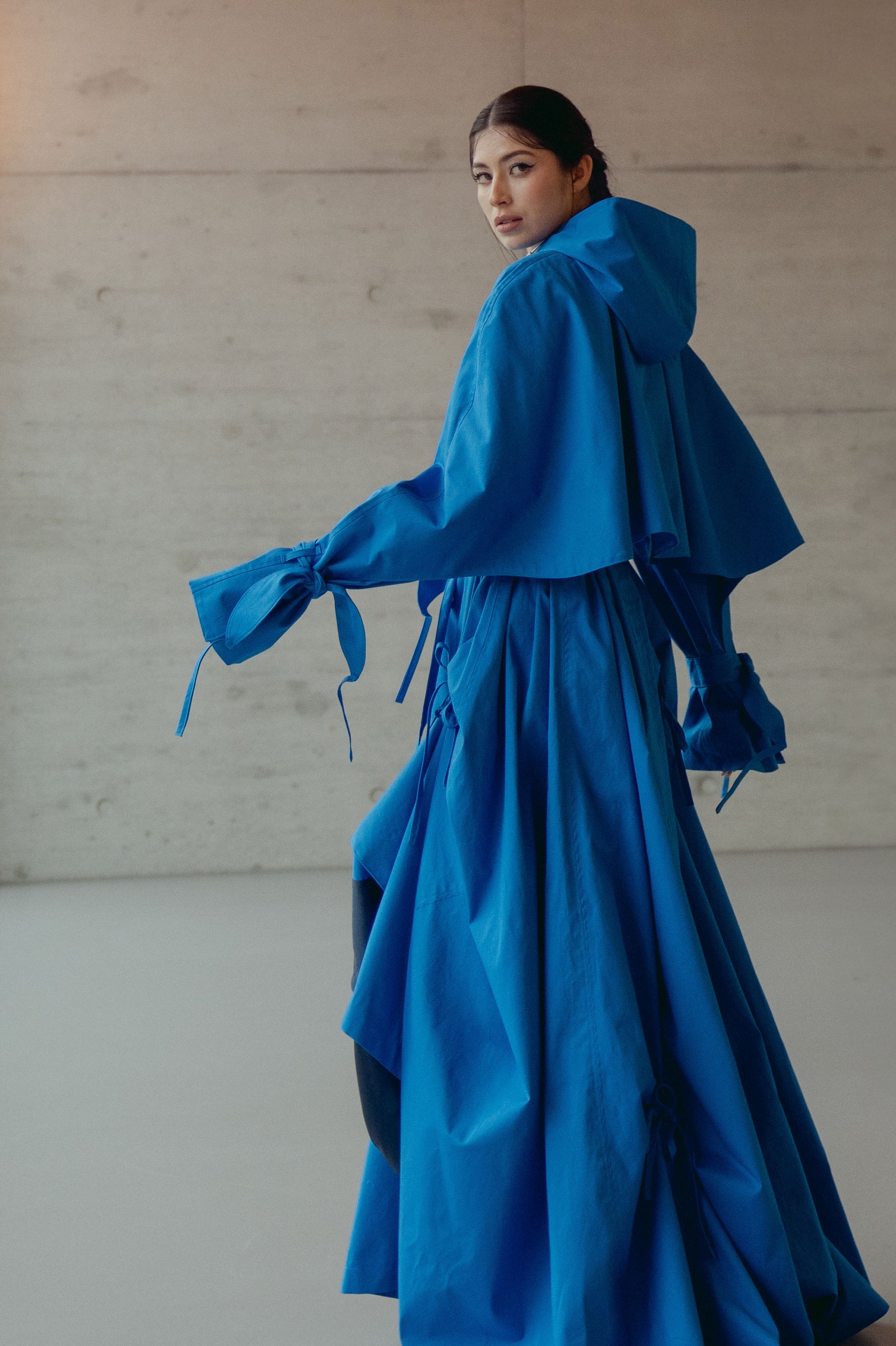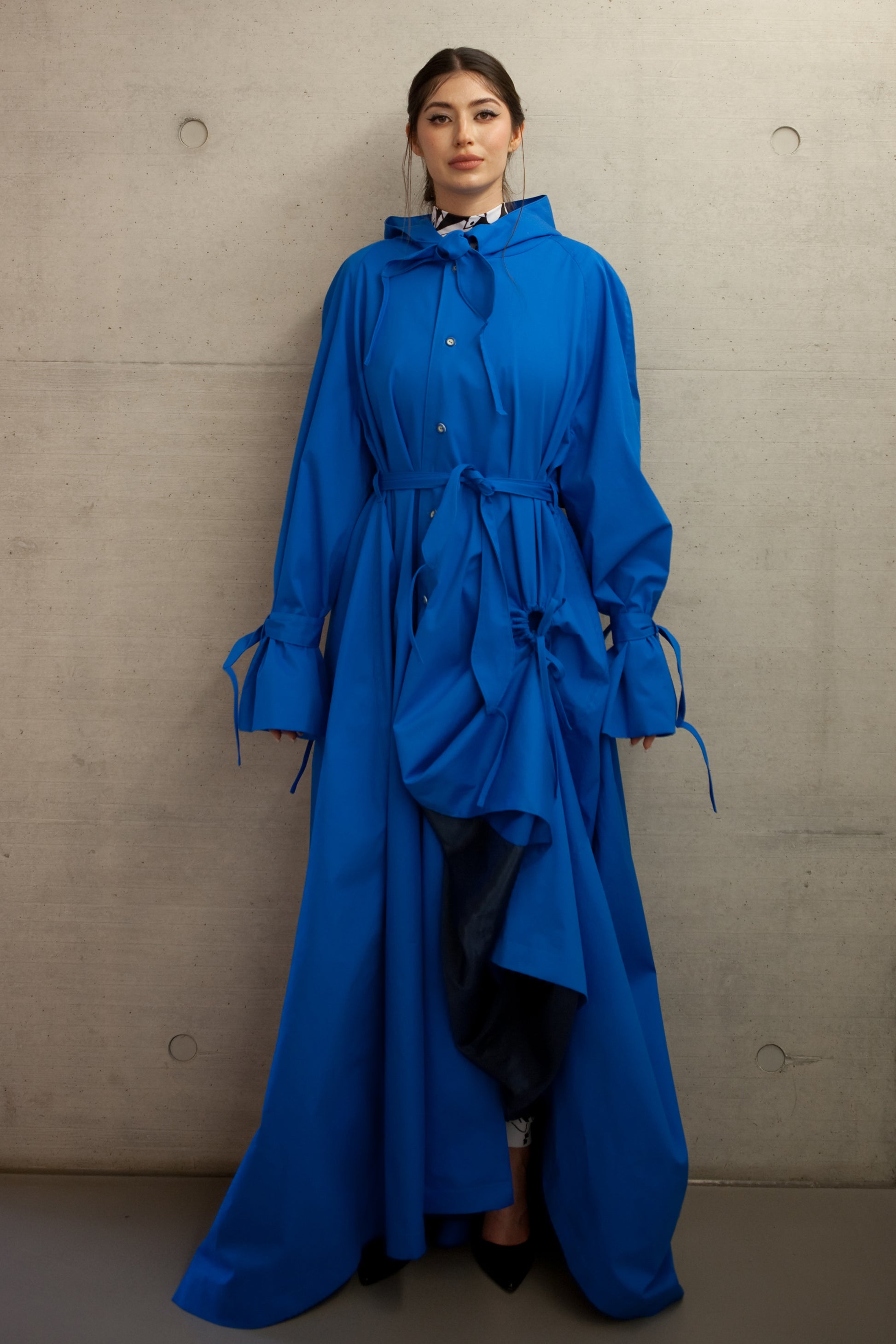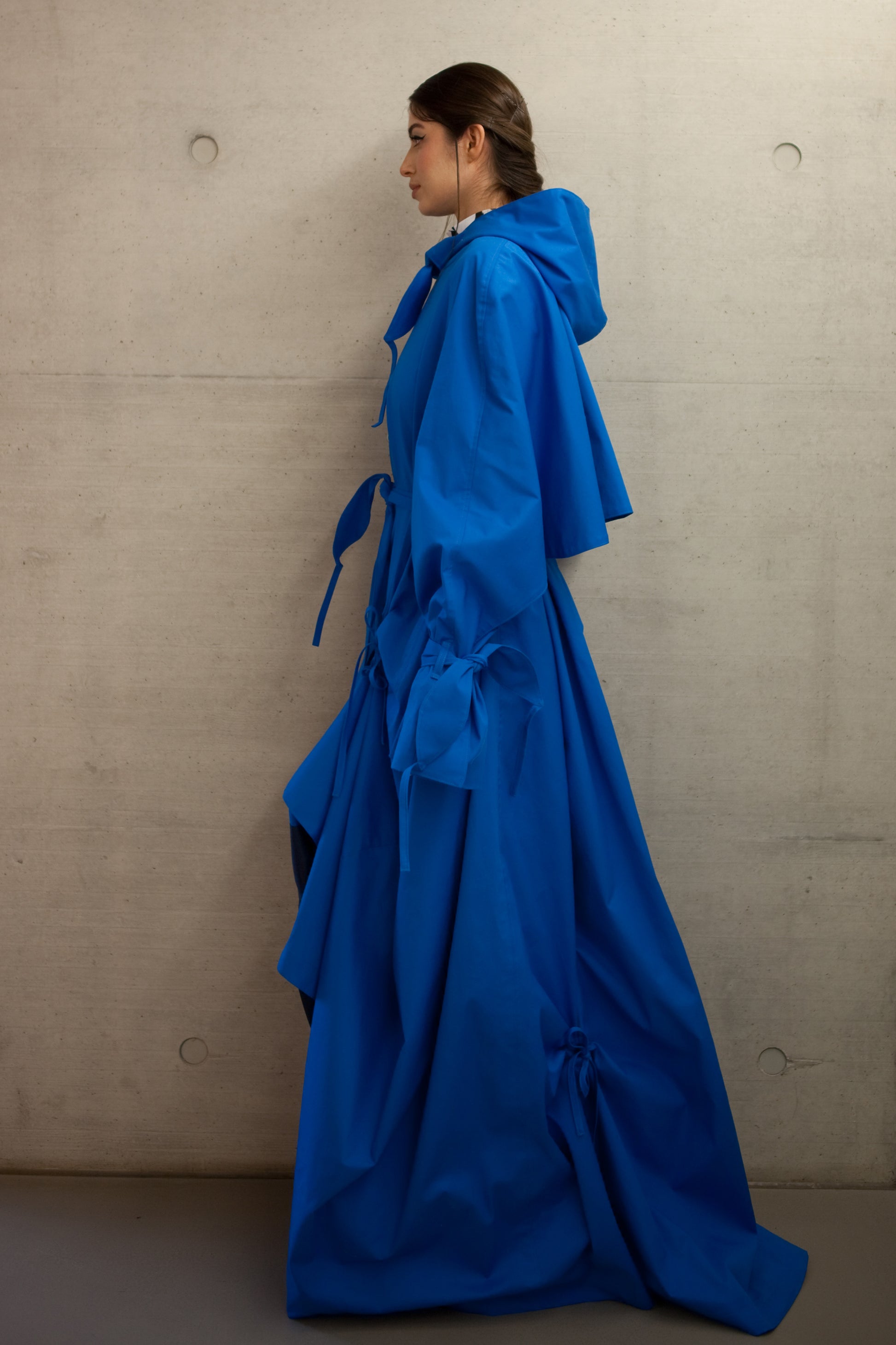 openings create a sculptural silhouette. The hood, belt, and cuffs can be adjusted
