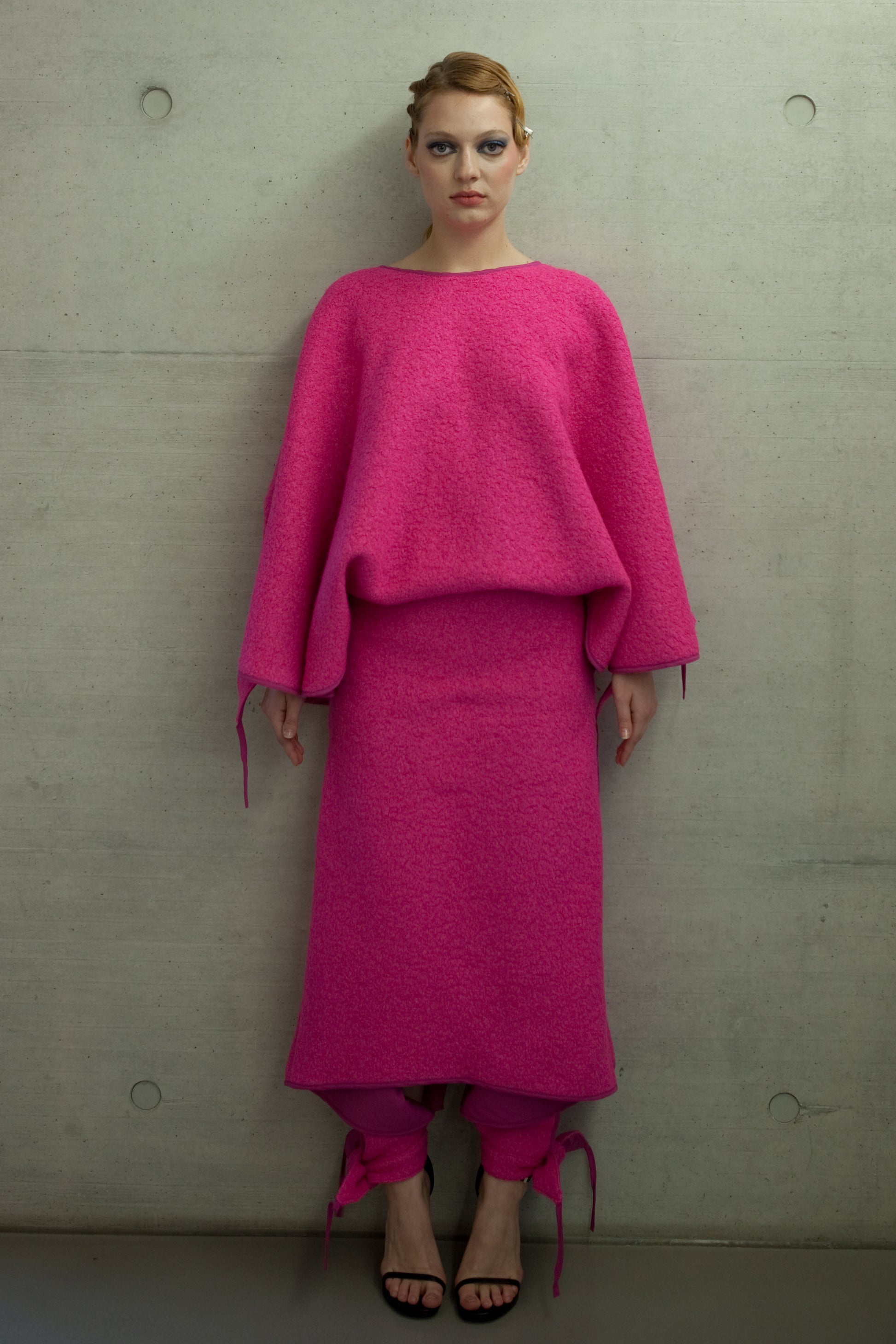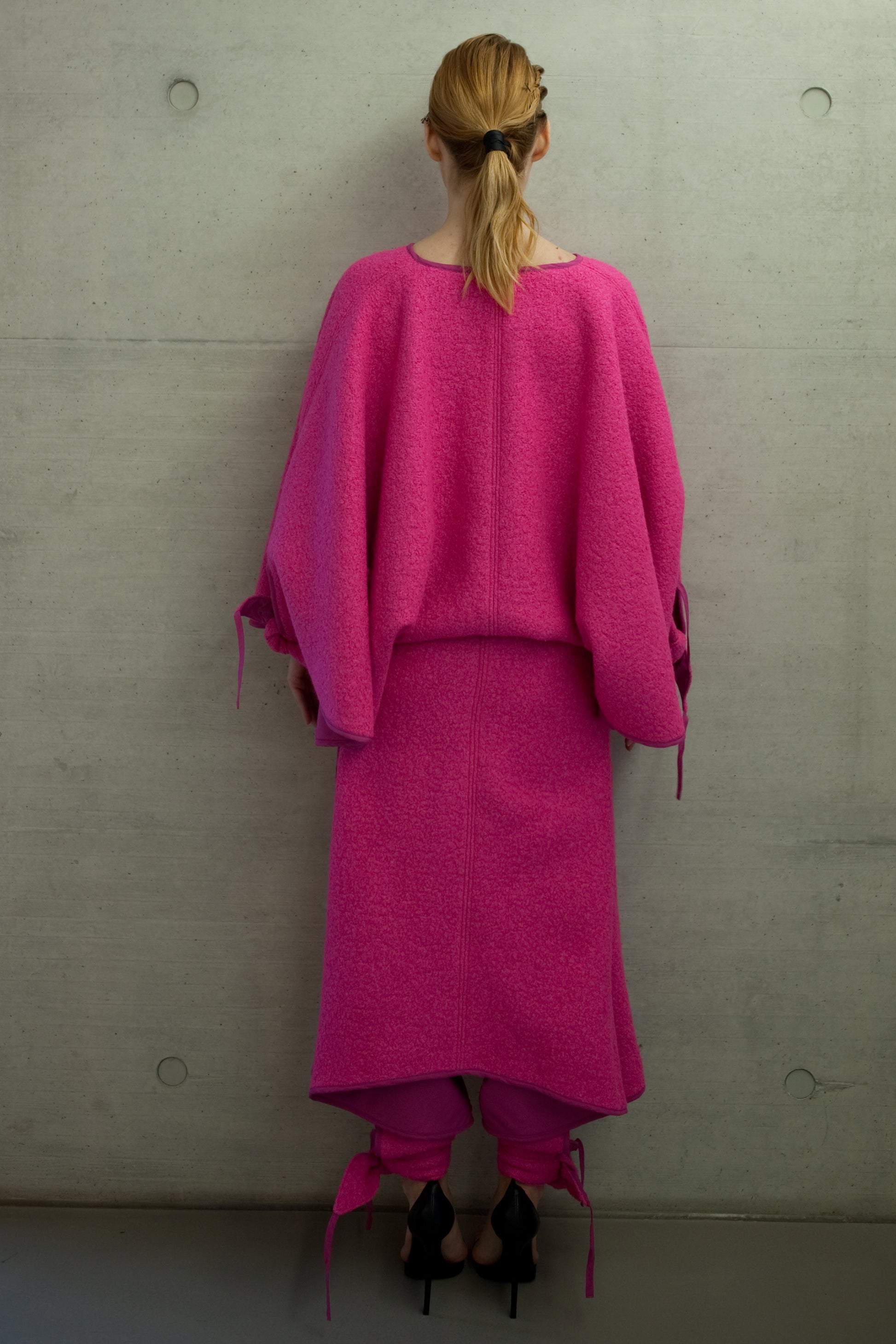 Crafted from structured pink wool, this jumpsuit offers both comfort and a soft,