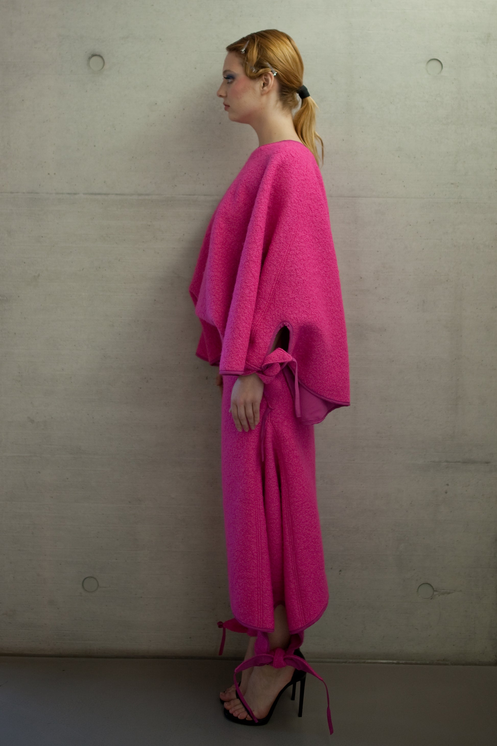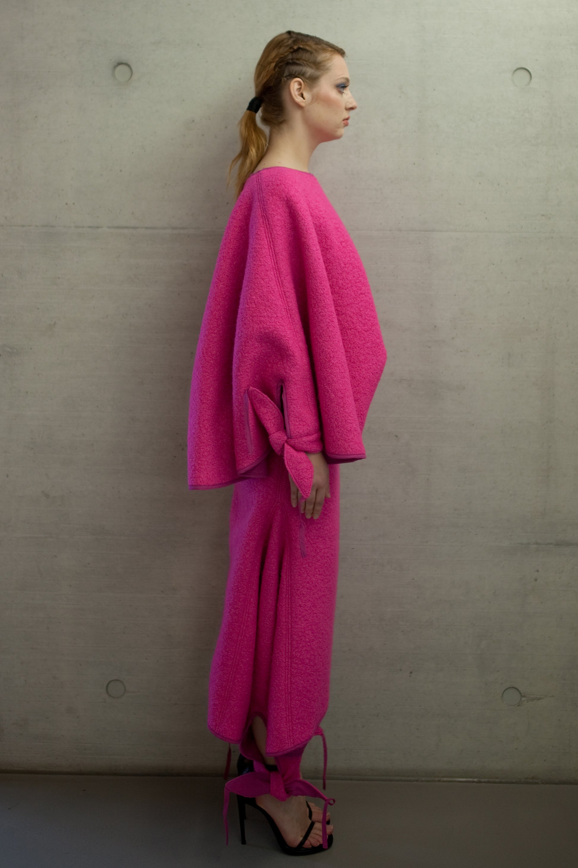 sculptural silhouette. A top cape adds volume and features adjustable bow-tied