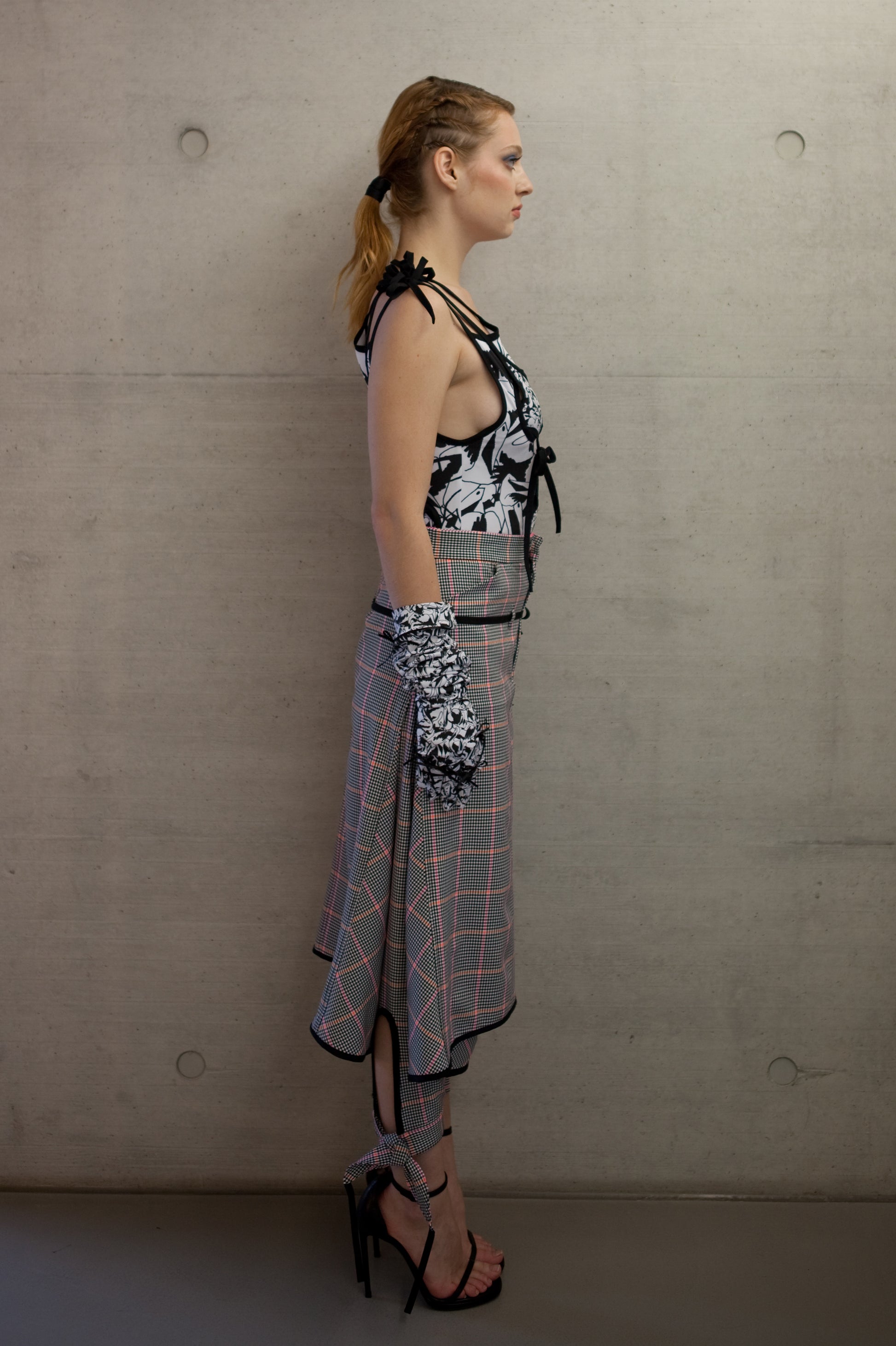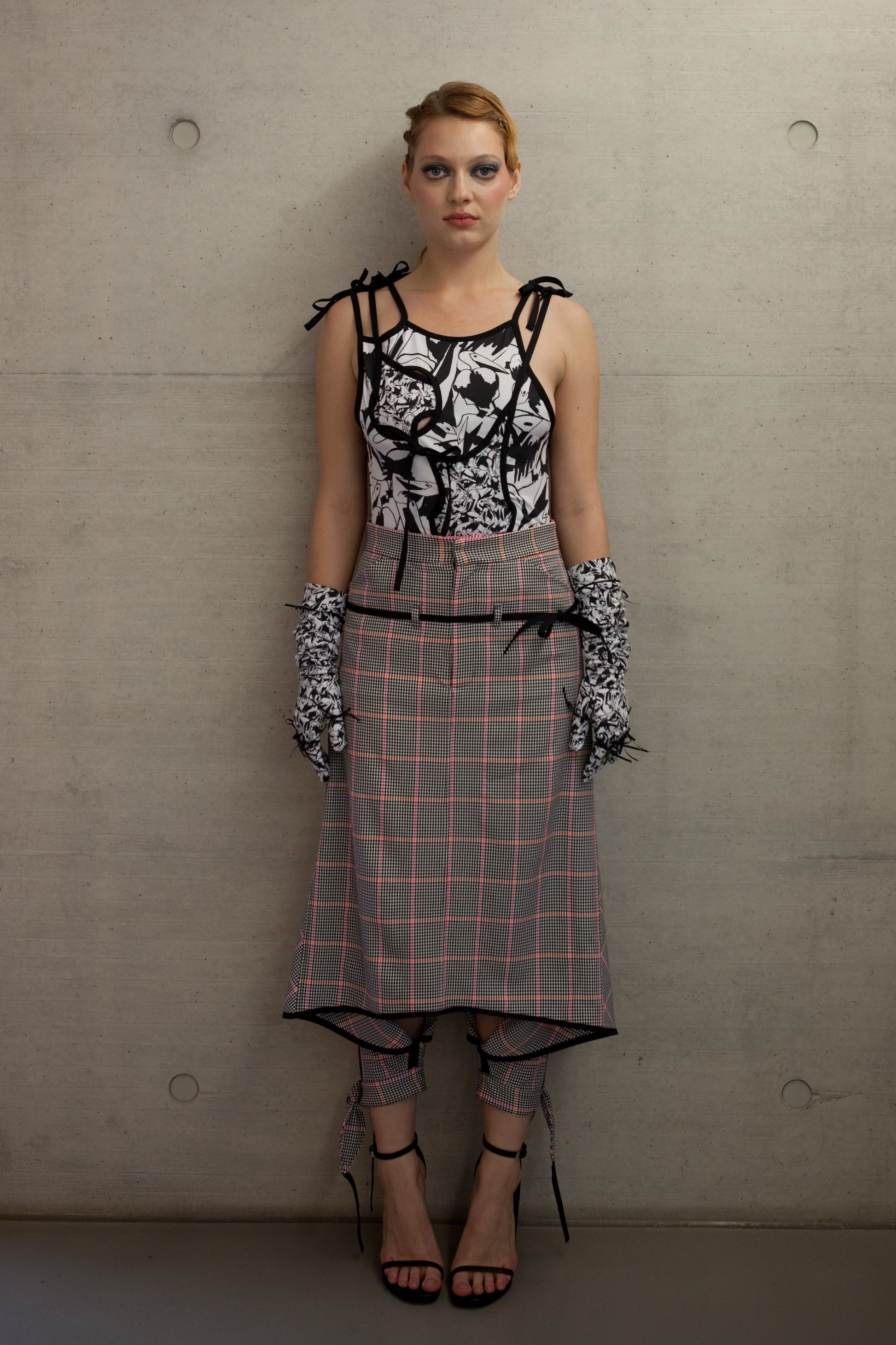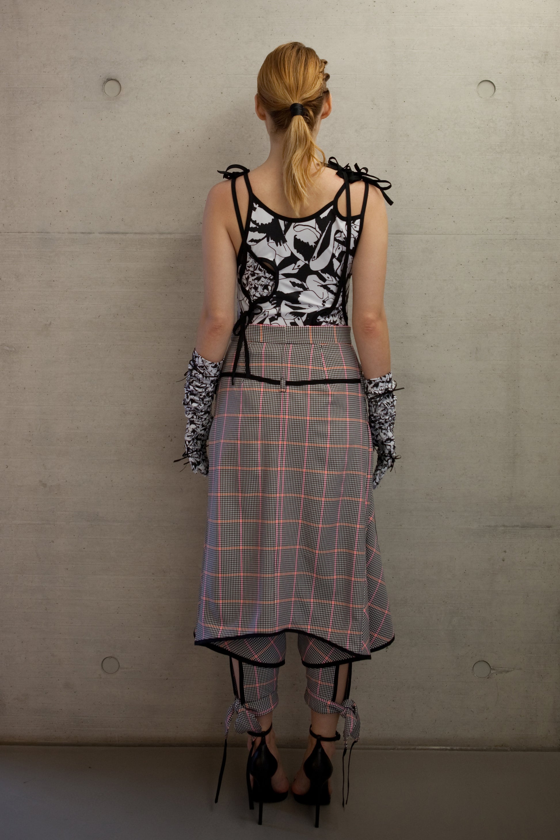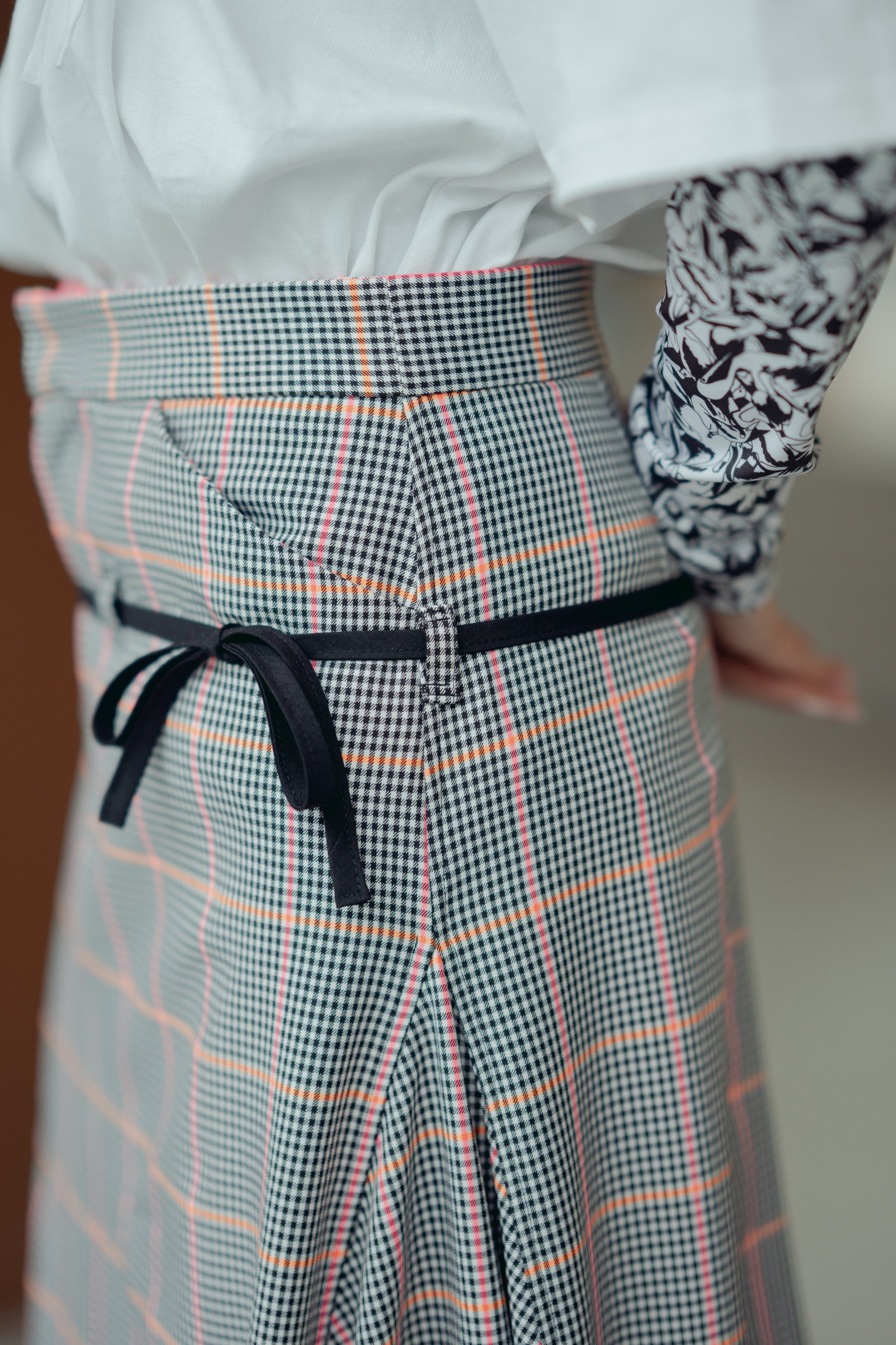 Crafted from checkered wool blend, these pants feature a skirt-like open bottom with adjustable bow-tied cuffs. A small black belt emphasizes the hips, while slash pockets add functionality.