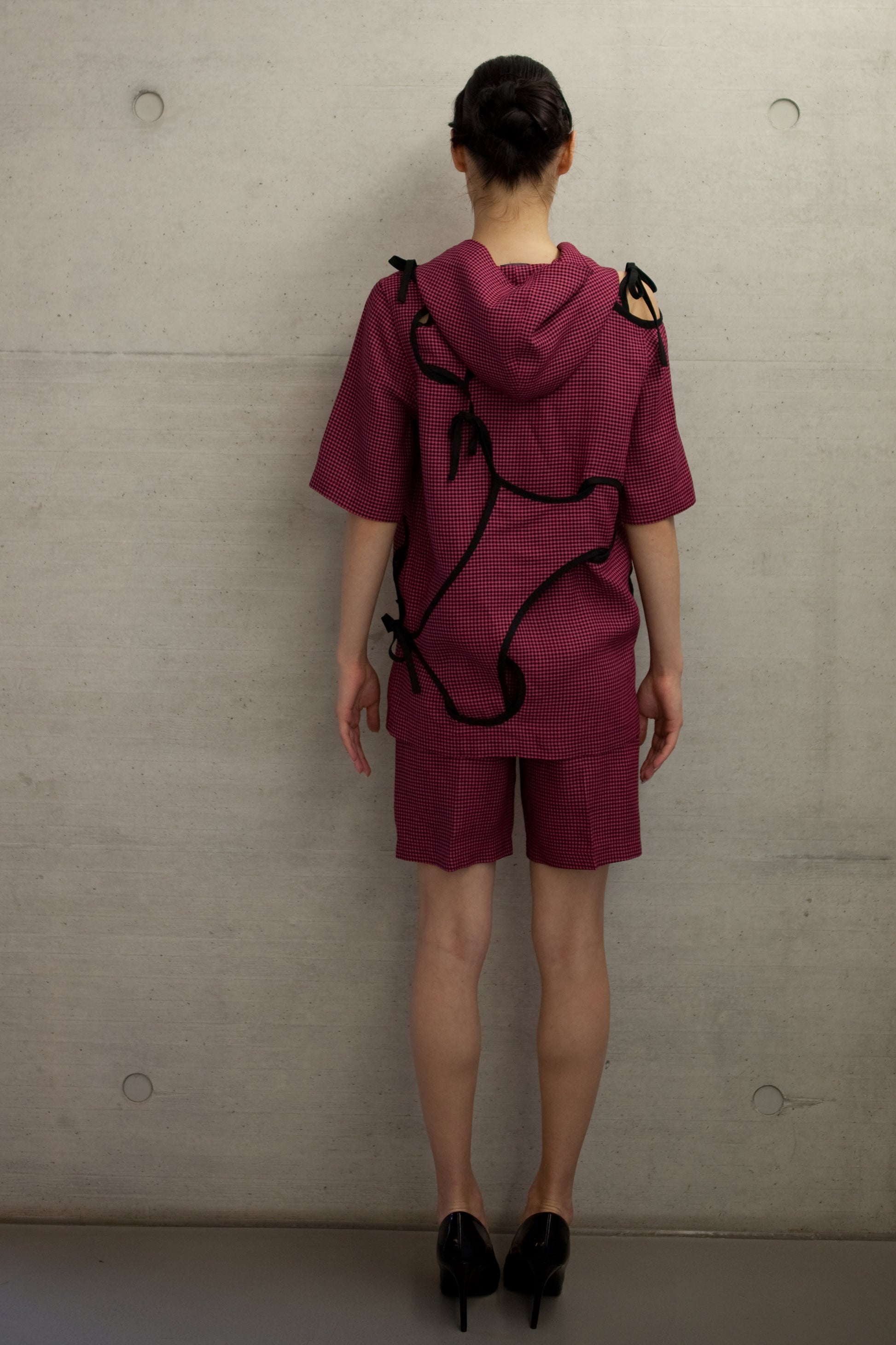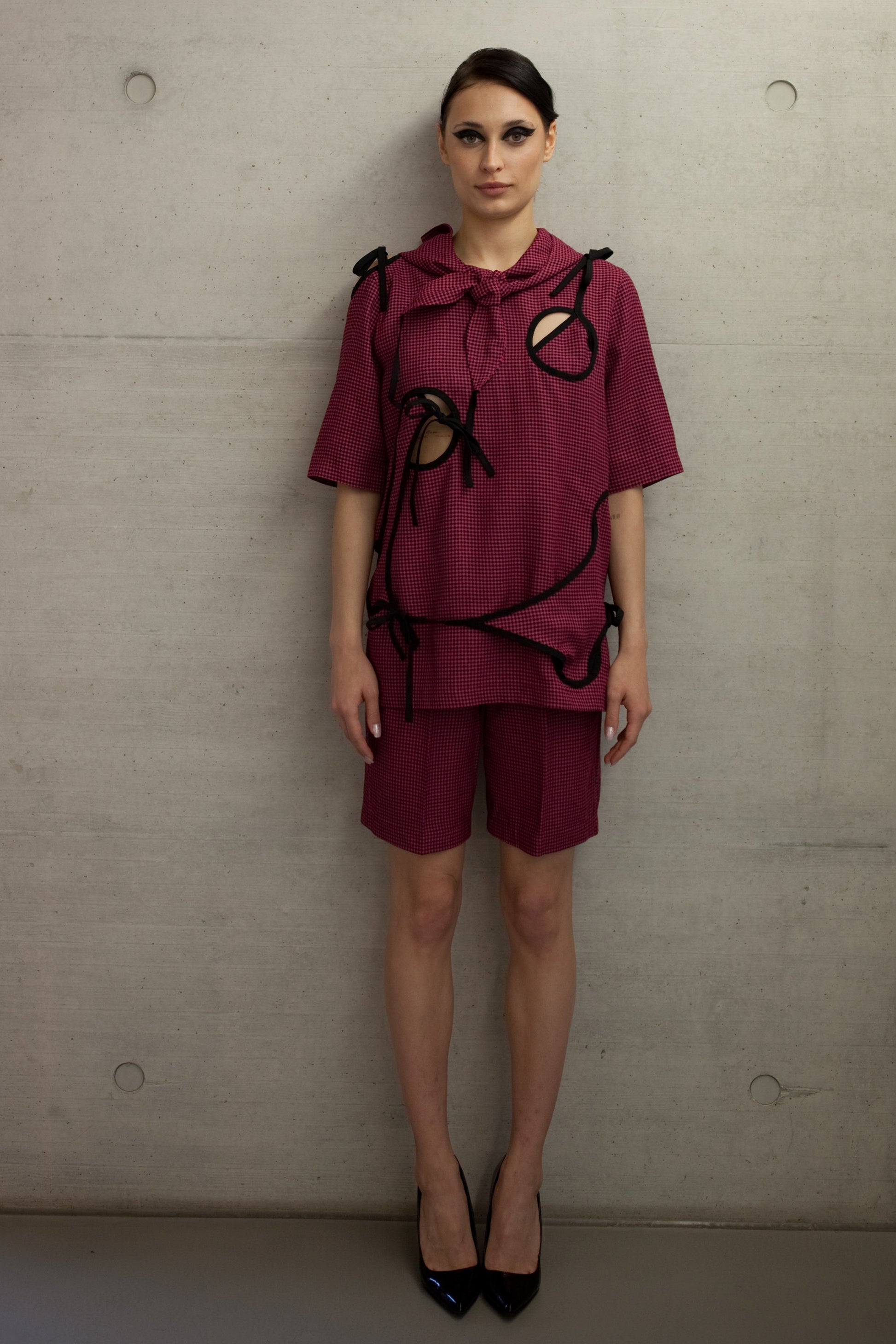 Crafted from checkered pink and black wool, these shorts feature slash pockets
