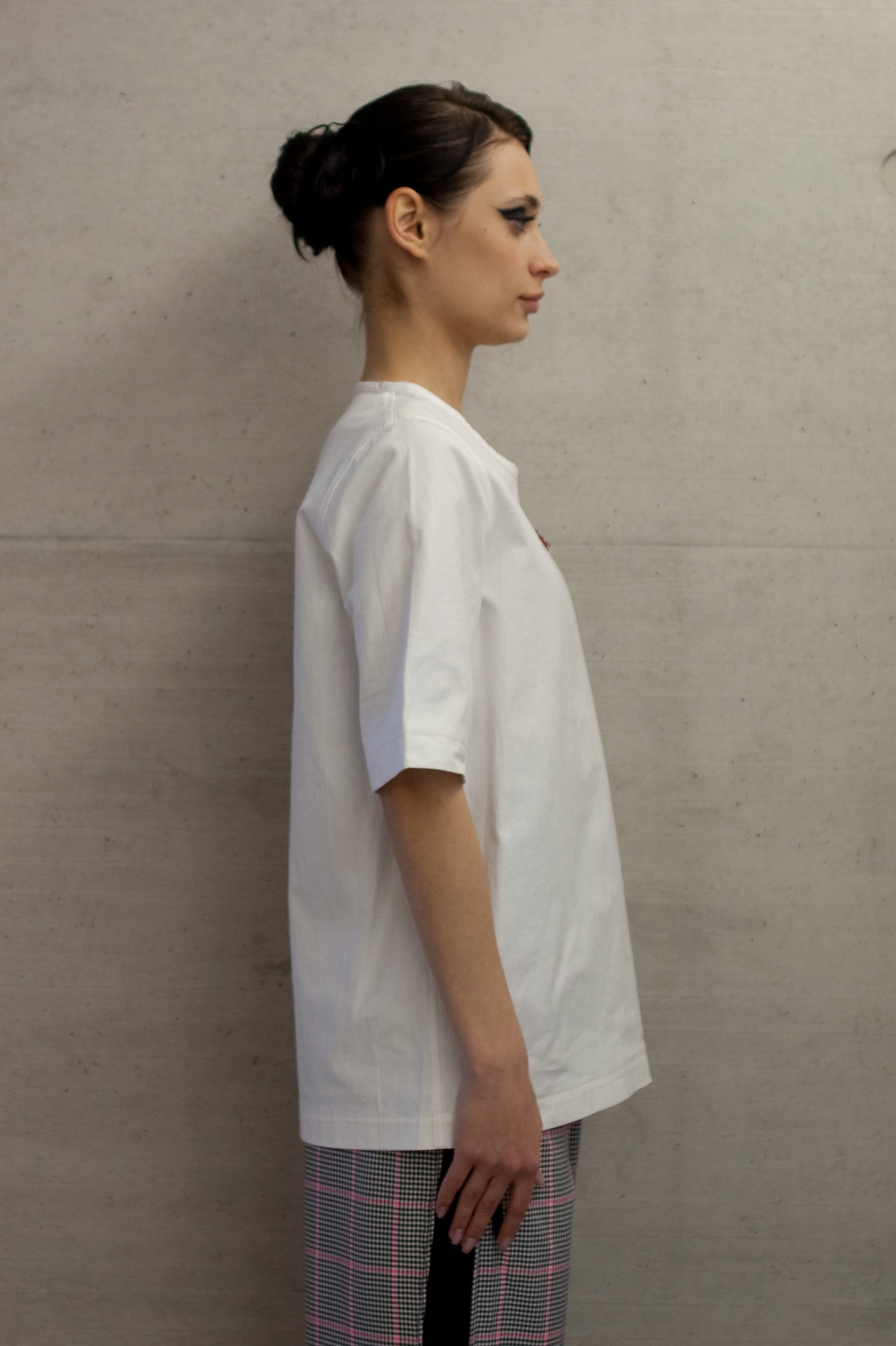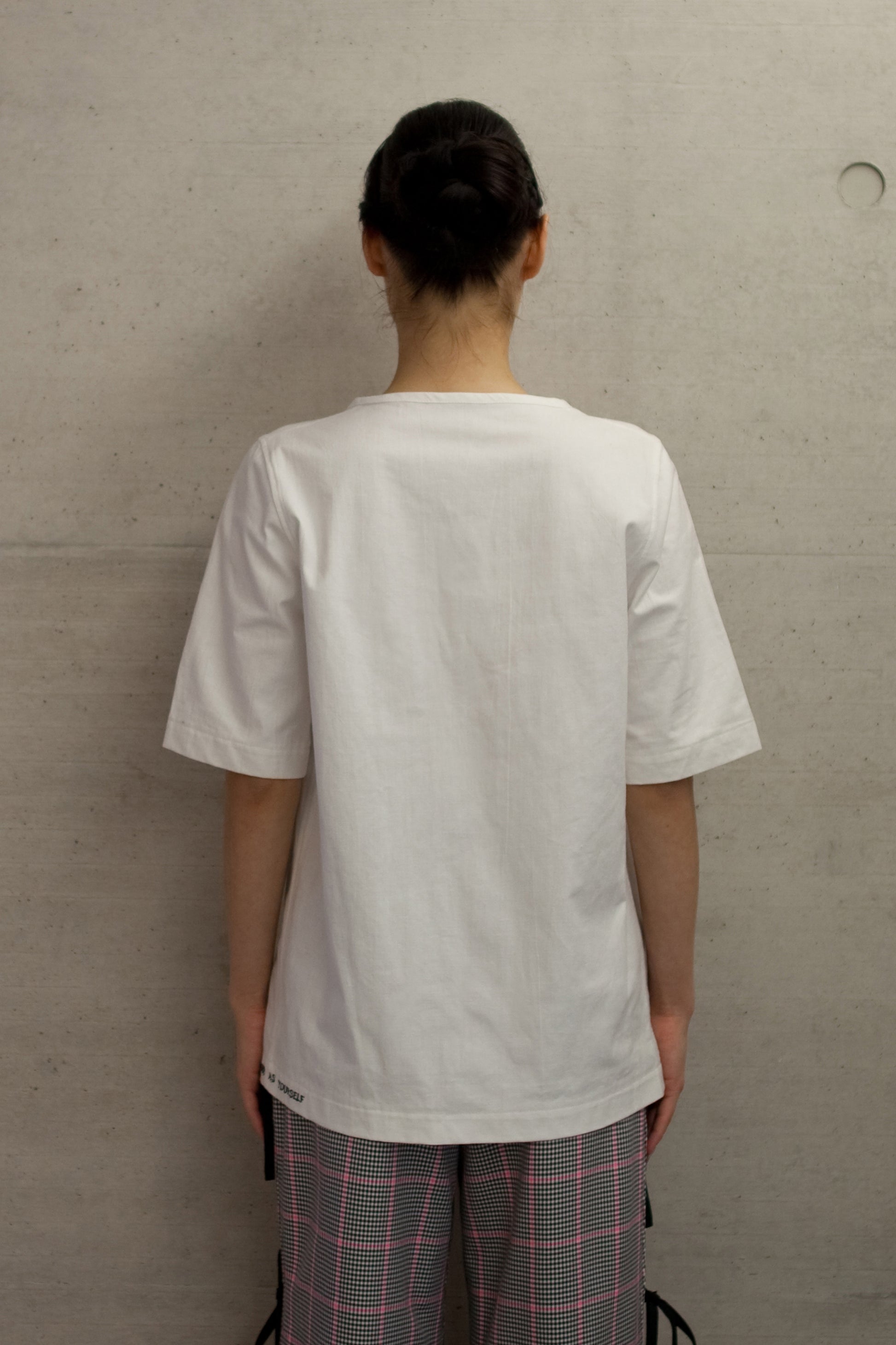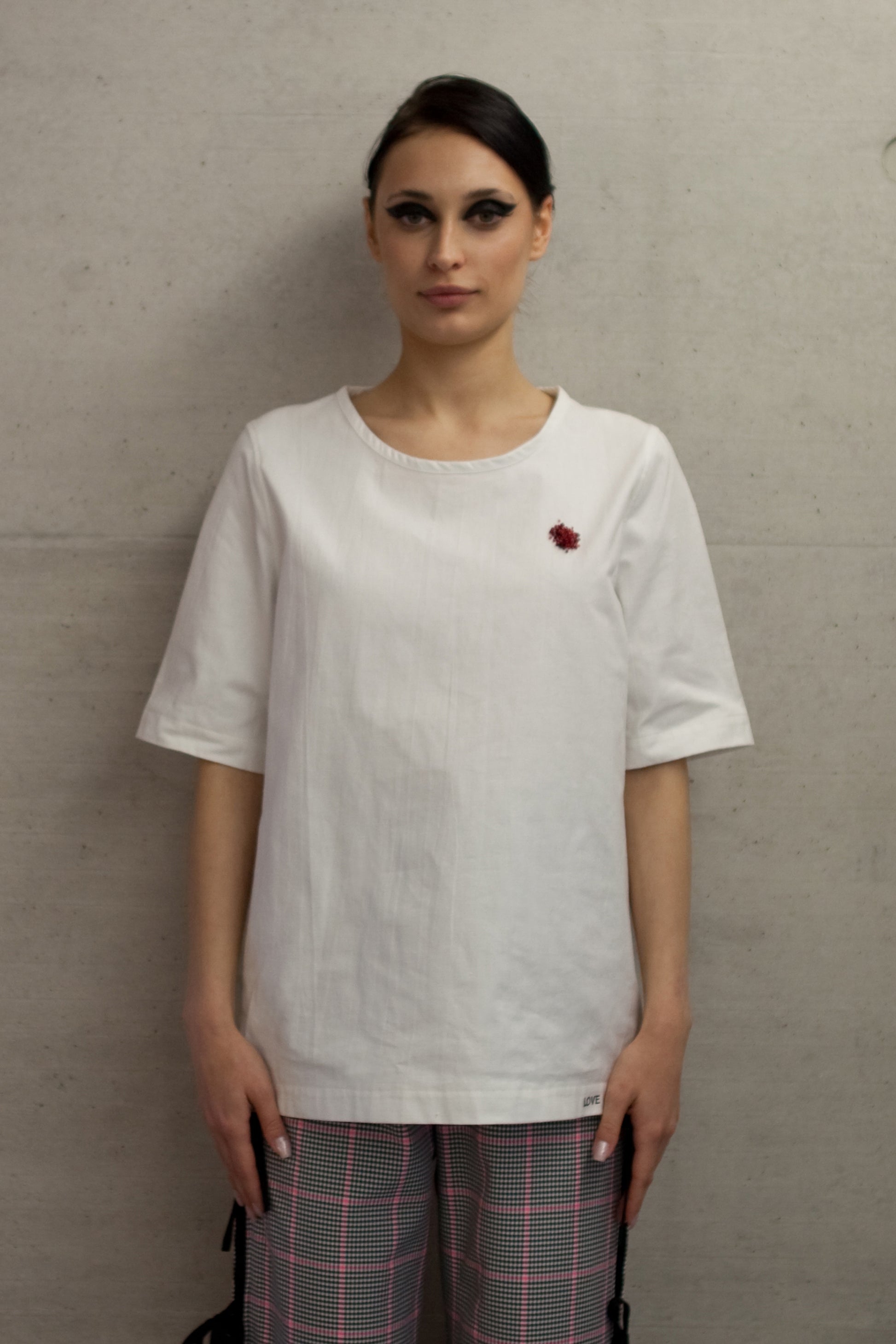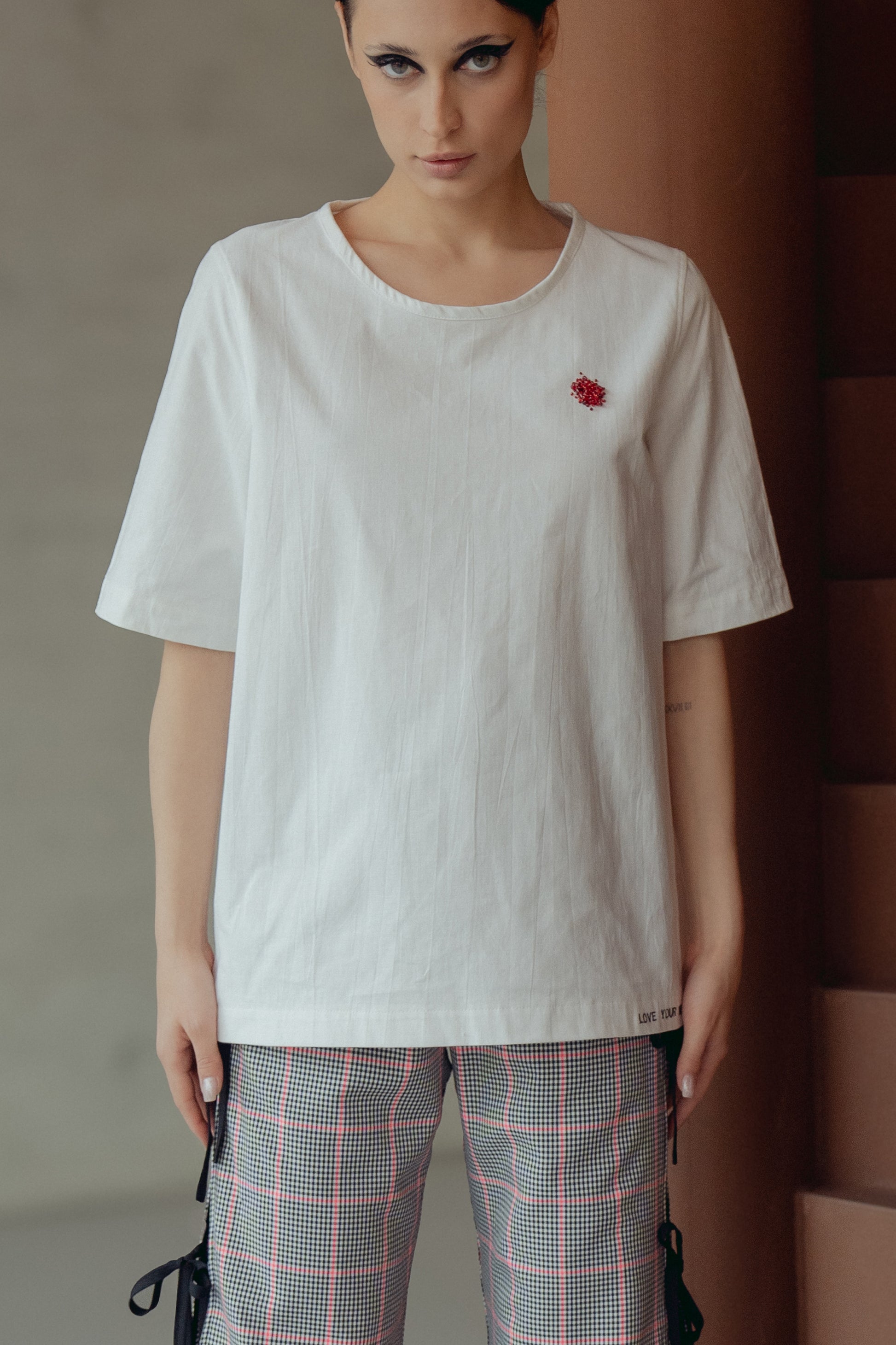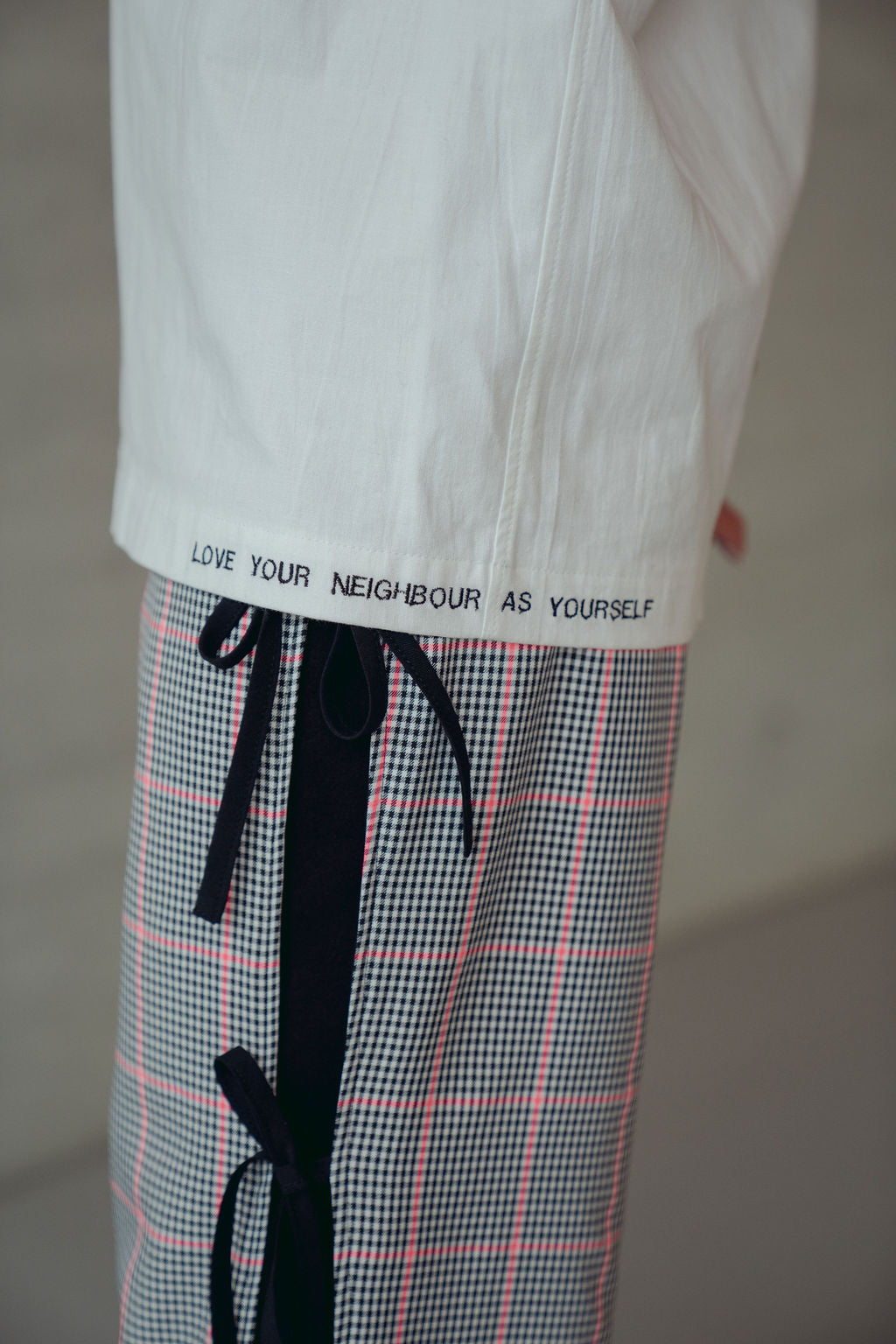 Crafted from white cotton, this top features Love Your Neighbour As Yourself embroidery along the bottom and red pearls in varying sizes on the left chest. Finished with a collar binding in main fabric.