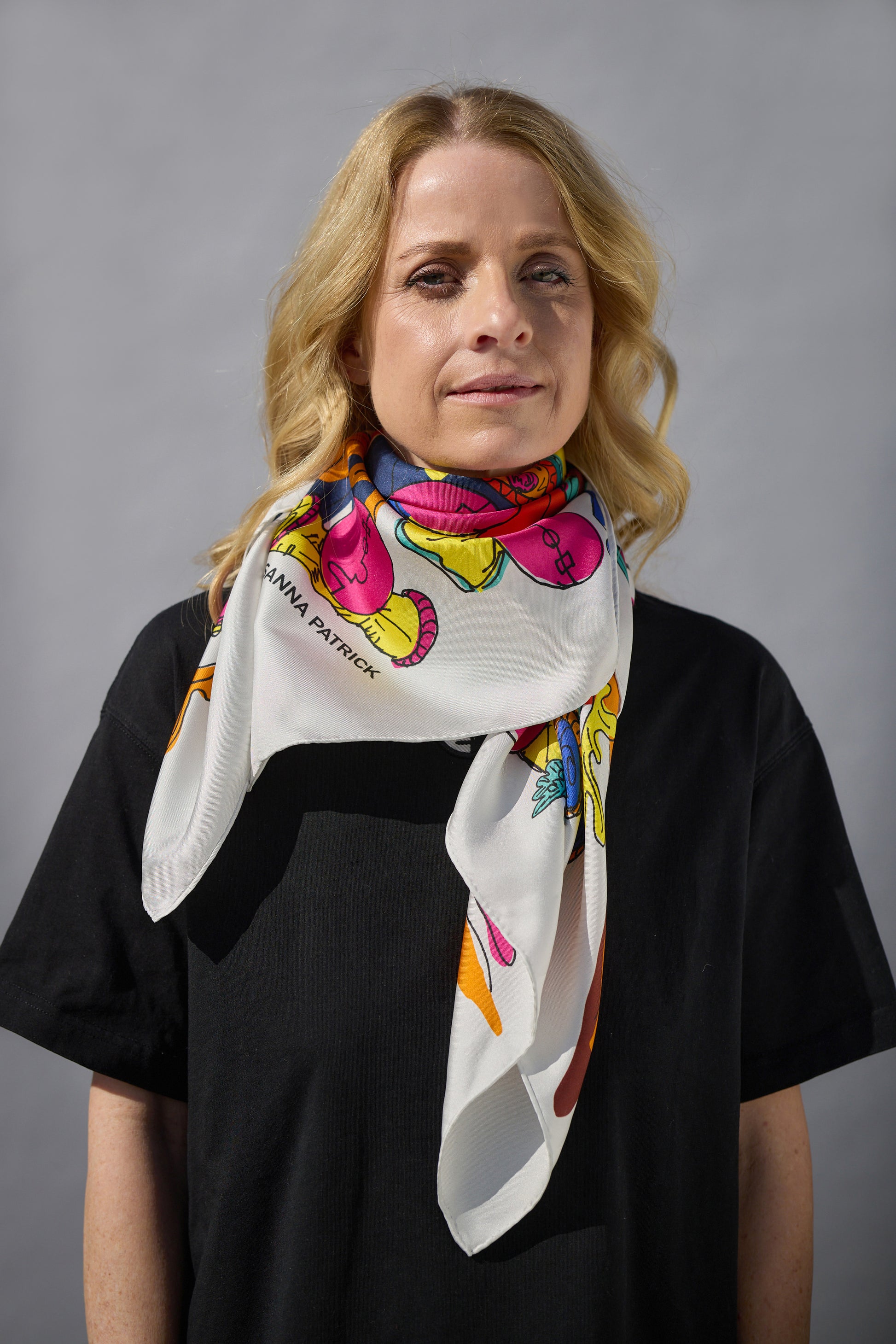 Silk twill foulard featuring the vibrant LOVELETTER picnic print. Finished with a hand-rolled hem. Size: 90 x 90 cm.