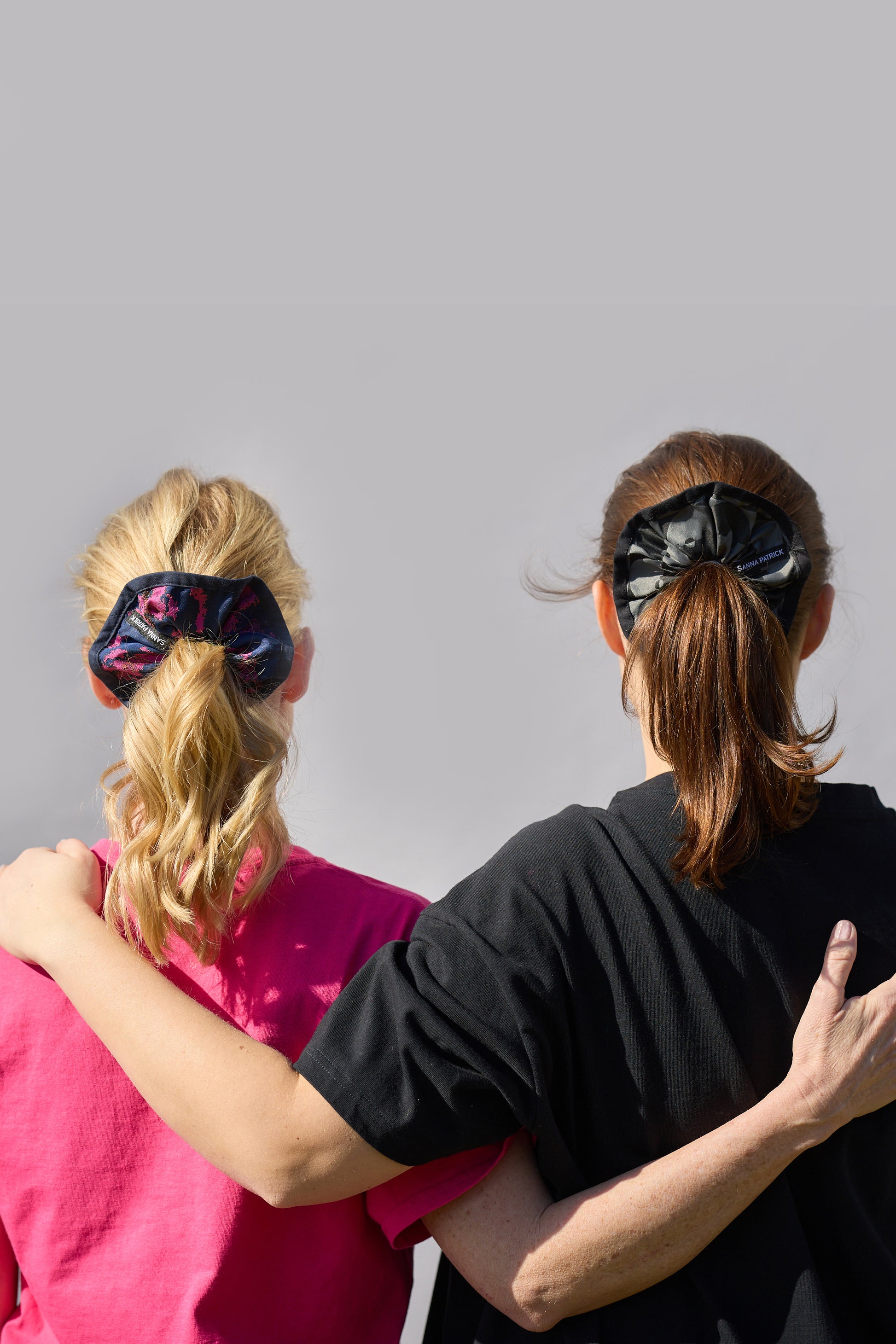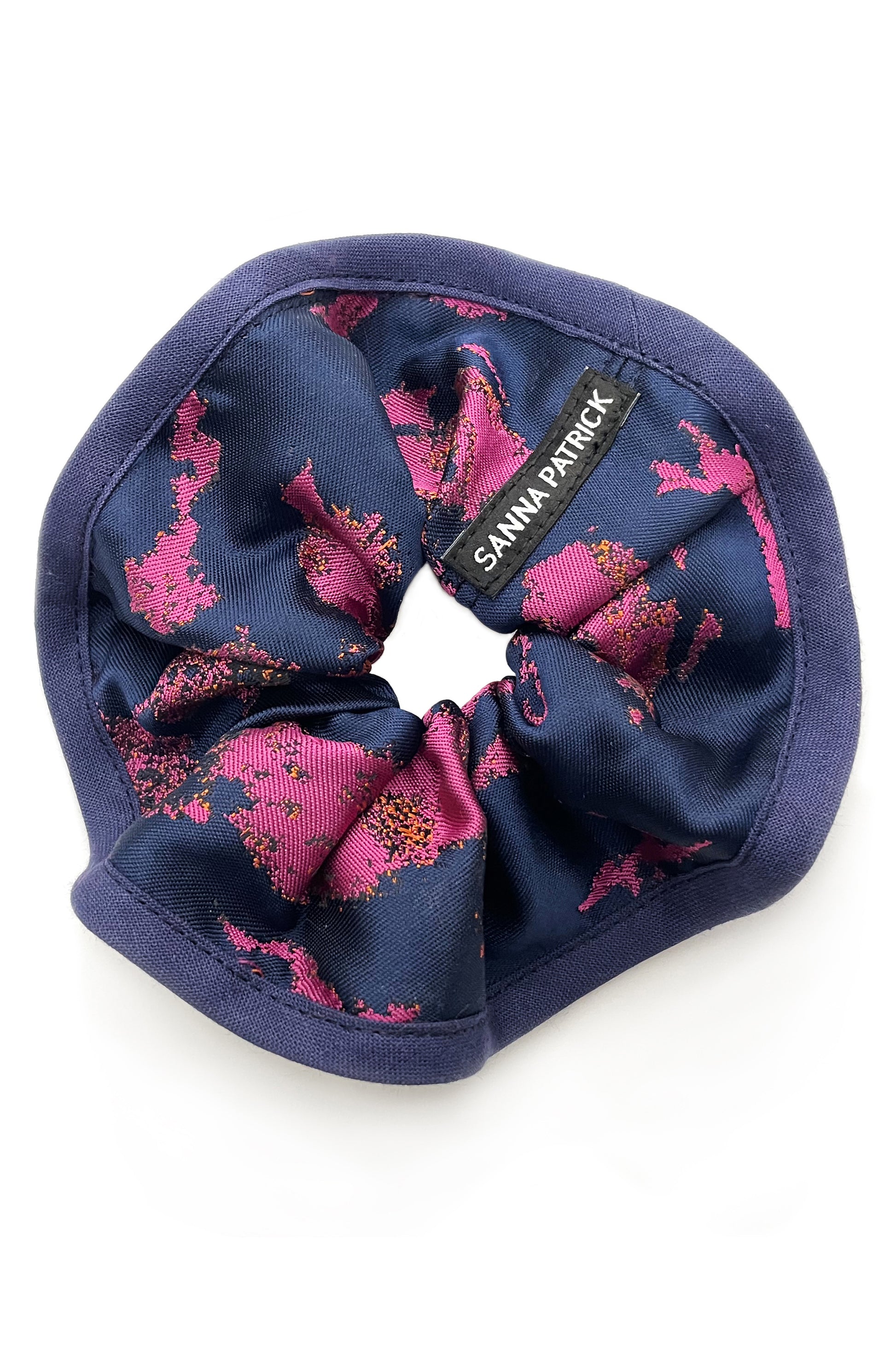Scrunchie crafted from our LOVELETTER jacquard fabric in navy, pink, and orange.