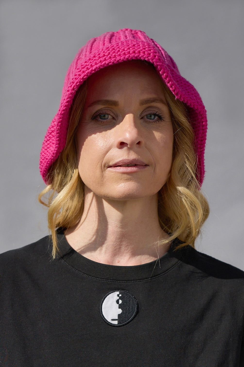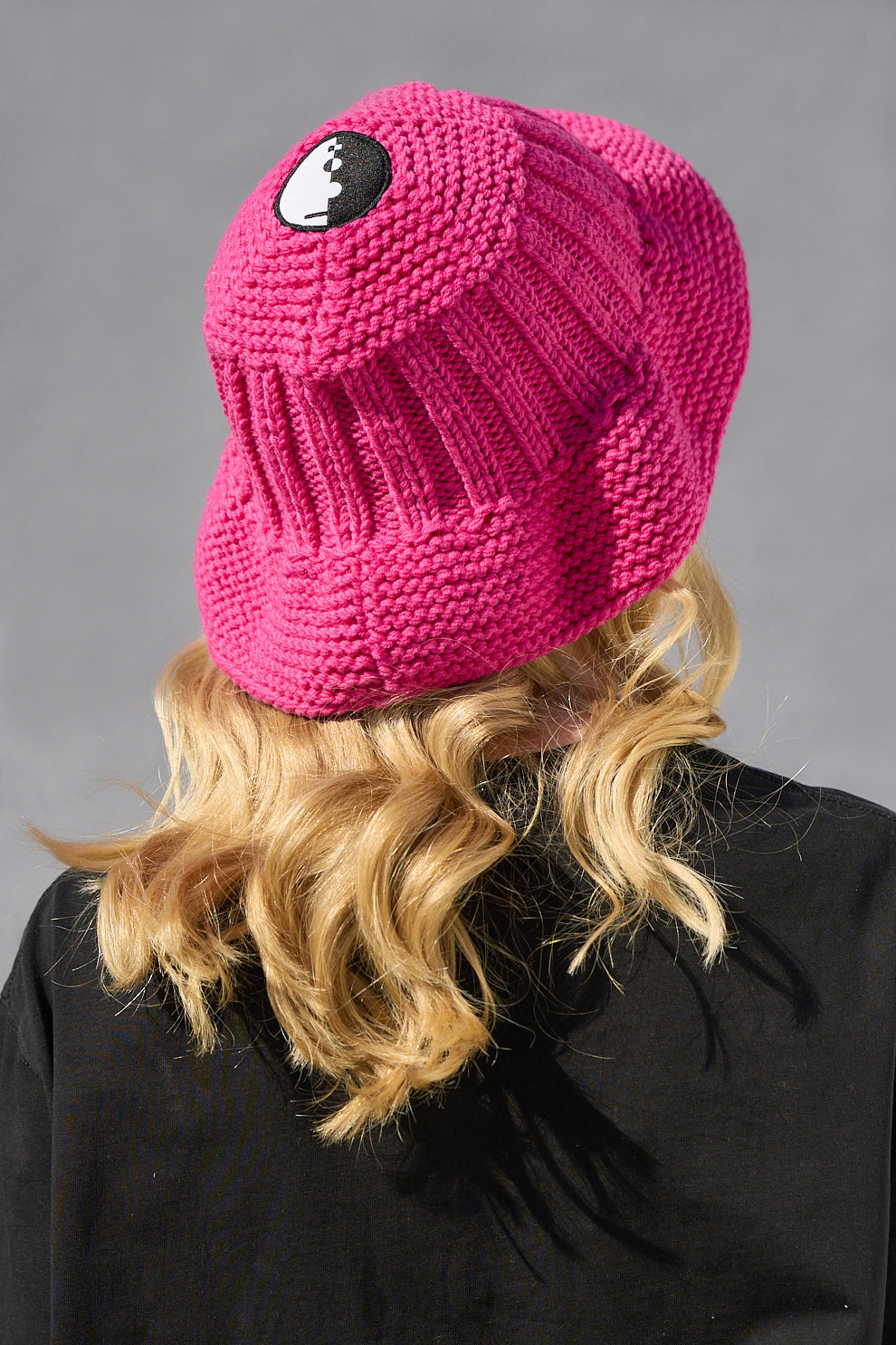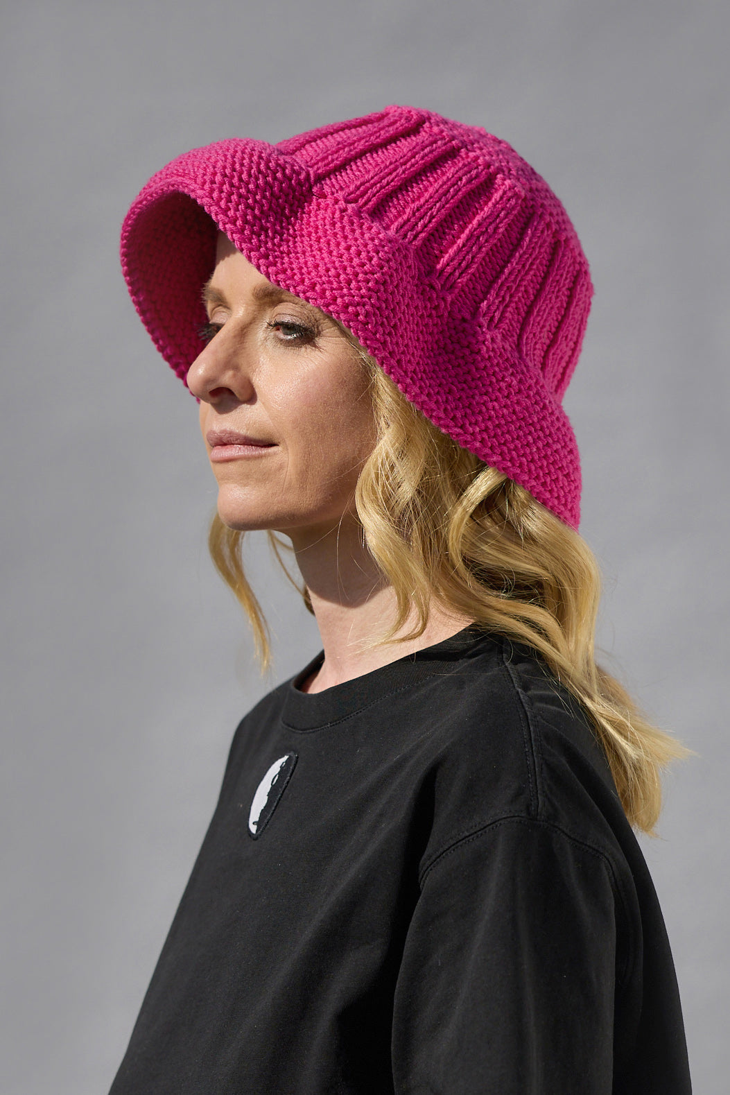 Hand-knitted bucket hat in pink merino wool, finished with our iconic embroidered Spherical Human patch.